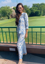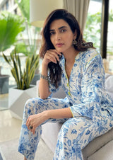 The Madura co-ord set in Cotton Silk features printed florals arranged tastefully in a bunch with the front open and pleating on the sleeves.It is finished with delicate detailing of neon buttons and fabric on the edges and neck, adding a contrast to the colour blue. The pants are completely printed in the floral print with a straight relaxed fit. A lightweight, breathable fabric - easy to wear all day long.• Straight leg