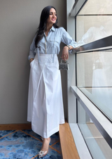 This coord set pairs the diamond-detailed Day Maker Shirt—a breathable, blue striped classic—with the crisply cut, A-line White We-Heart Skirt. Tailored yet relaxed, it adds playful polish to your everyday look.