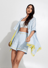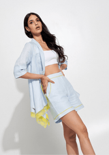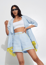 A two-piece set that is lightweight, breezy, and perfect for soaking up the sun. Features an oversized jacket paired with mid-waist shorts.